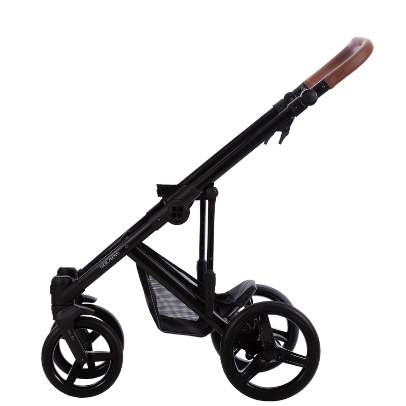 Рама в модели Solaris 3 в 1 алюминиевая. Цельная регулируемая ручка в месте хвата покрыта приятной на ощупь экокожей. Есть опция автоматической блокировки. Колеса полиуретановые, ненадувные. Передние колеса — с функцией свободного вращения, что пригодится на идеально ровной поверхности или для лавирования в ограниченном пространстве. Стоят системы поглощения колебаний (SAS) и памяти направления (DMS). Задние колеса дополнены пружинными амортизаторами и тормозной системой stop/go. Также амортизаторы с регулировкой по жесткости и мягкости установлены на раме. Корзина съемная, открытого типа.
