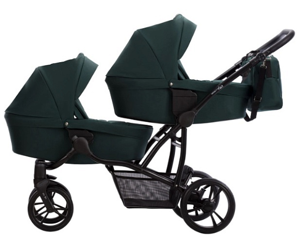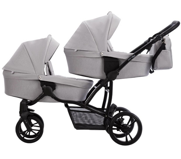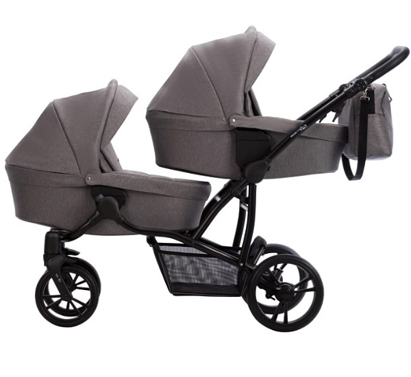 В комплект входят алюминиевая рама с четырьмя ненадувными колесами, две люльки с накидками, съемной хлопковой обивкой и матрасами, два прогулочных блока с накидками на ножки, пятиточечными ремнями и съемными бамперами, а также два комплекта адаптеров для регулировки высоты люлек. Дополнительно: сумка для мамы с креплением через плечо, две универсальные москитные сетки, два универсальных дождевика, подстаканник и открытая текстильная корзина для покупок. Эти аксессуары делают прогулки с двойняшками удобными и практичными в любых условиях.