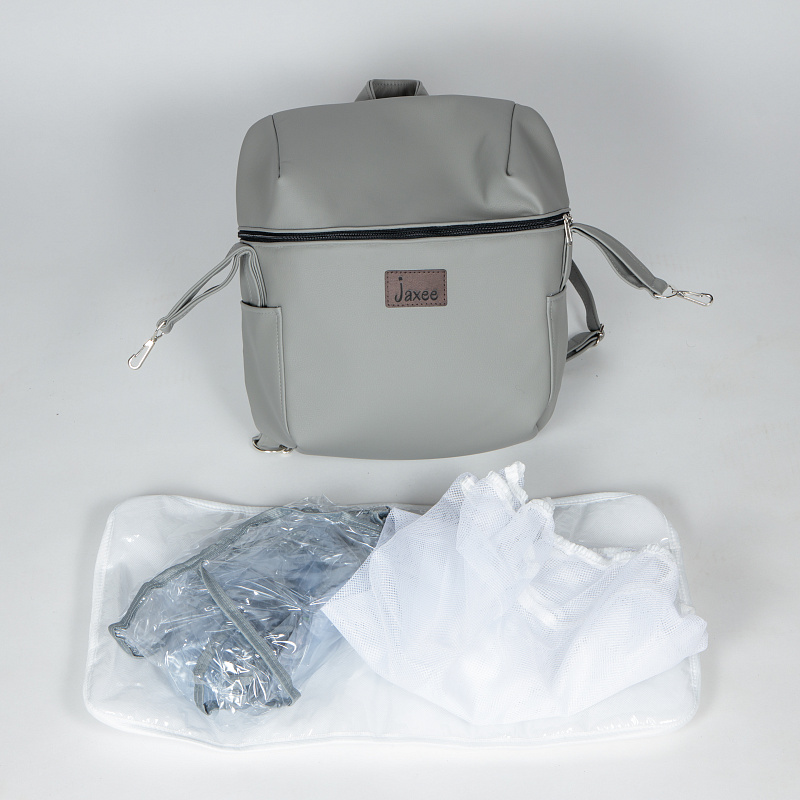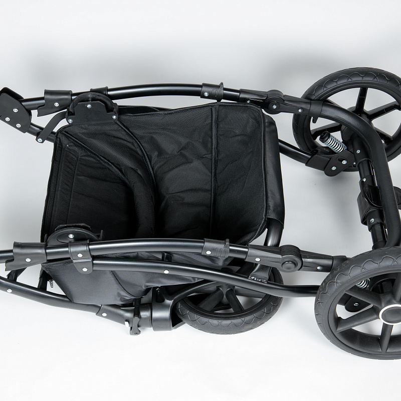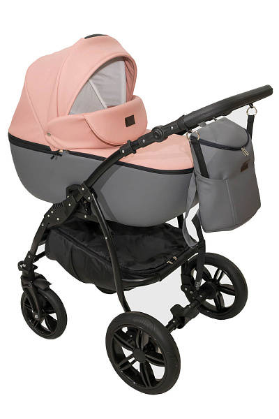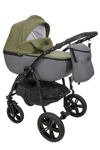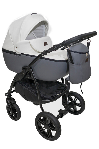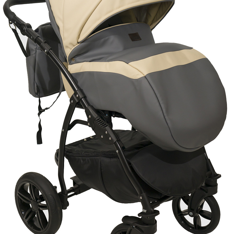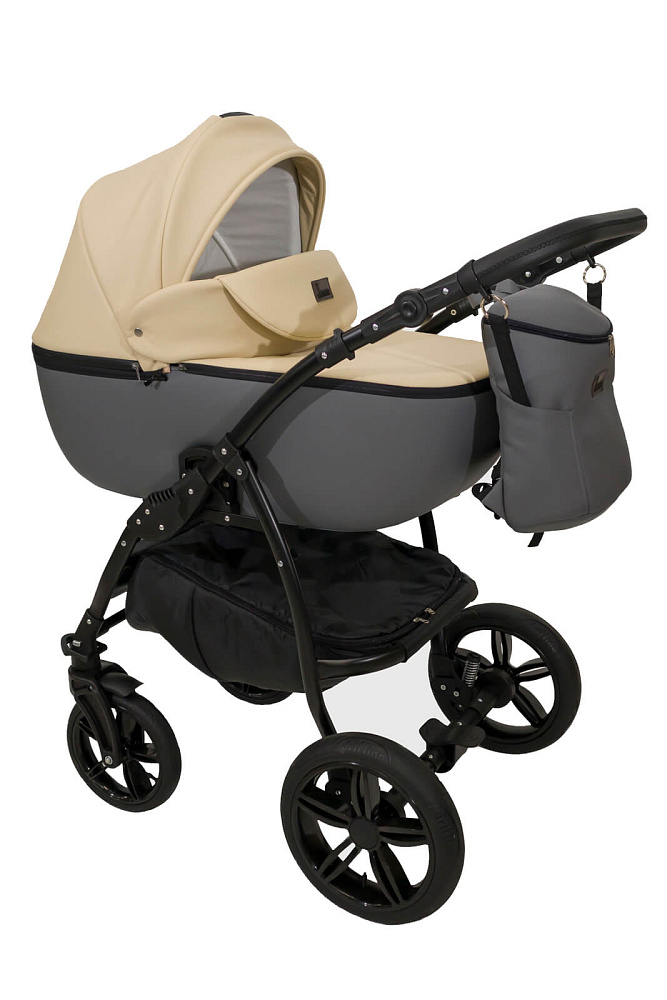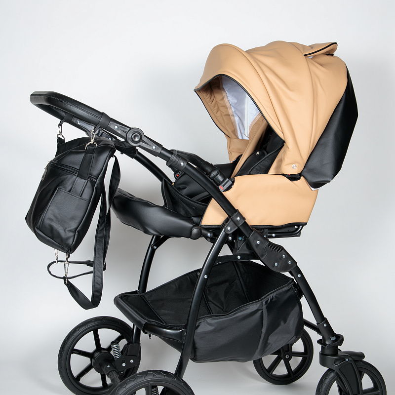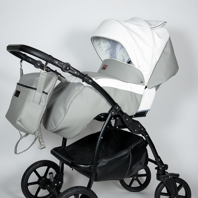 Люлька, прогулочный блок, автолюлька крепятся и снимаются с рамы по коляски нажатием на кнопки по бокам. В козырьке люльки установлена удобная широкая ручка, обтянутая эко-кожей, для удобства. Рама складывается компактно, в комплекте идет стильный рюкзачок, москитная сетка и дождевик.