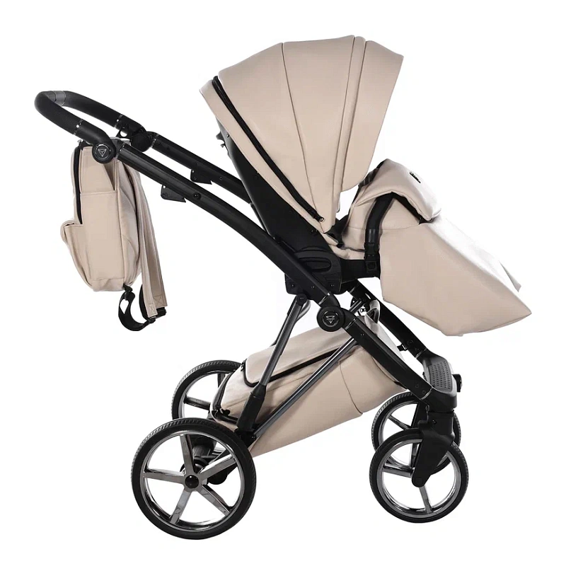Управлять коляской можно с помощью регулируемой по высоте ручки с покрытием из экокожи. Рама складывается «книжкой». Колеса резиновые, произведены из практичной вспененной резины, которую не нужно подкачивать и которая не пробивается. Спереди колеса обладают функцией свободного вращения. Шасси оснащено пружинными амортизаторами. Тормоз удобный, ножной. Есть закрытая текстильная сумка для вещей.