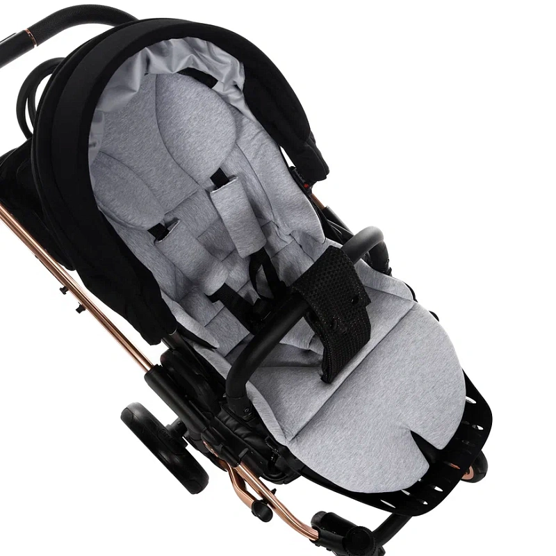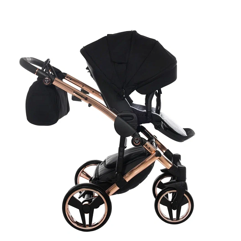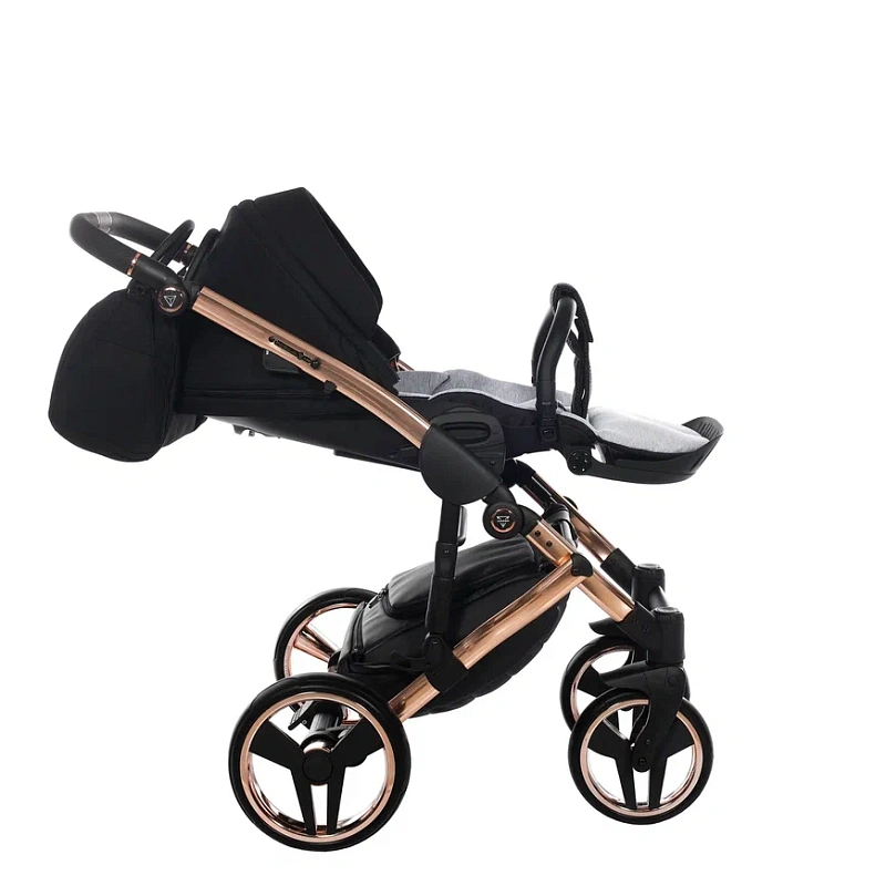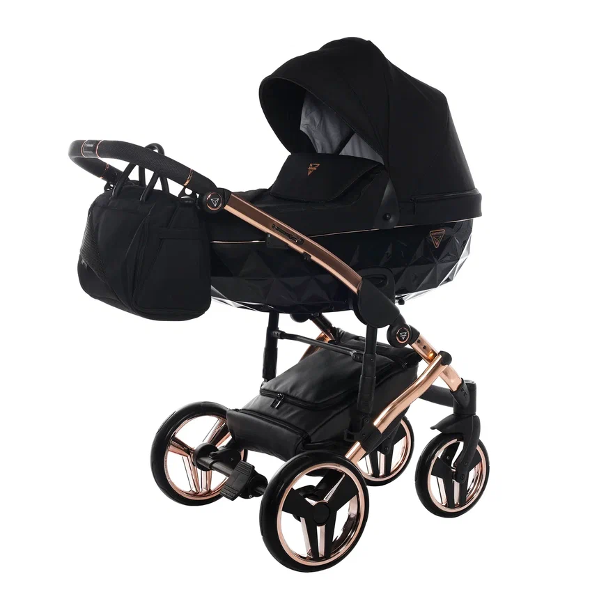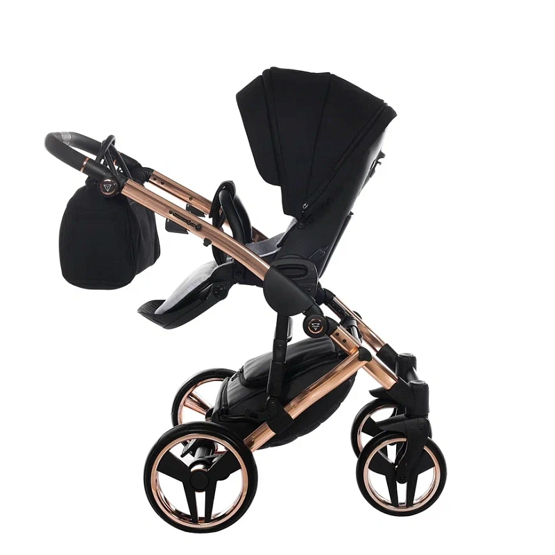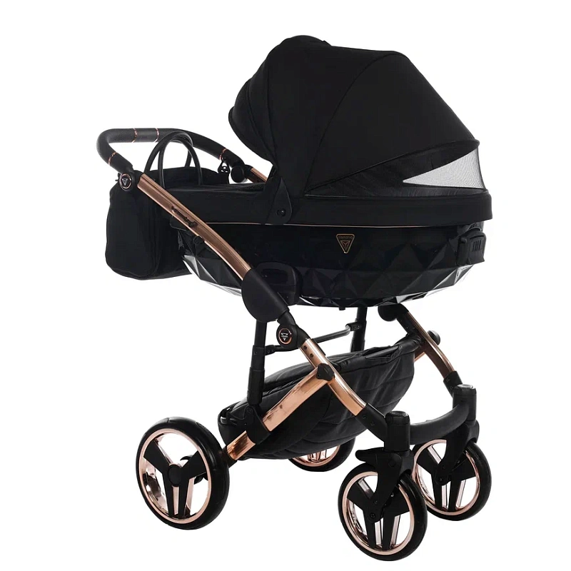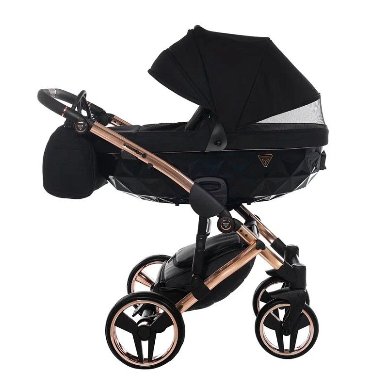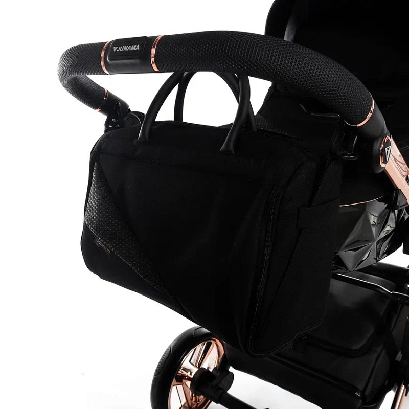 Коляска Junama Diamond Individual V2 3 в 1 на медной раме укомплектована чехлом на ножки, сумкой на ручку, держателем для бутылочки, дождевиком и москитной сеткой.