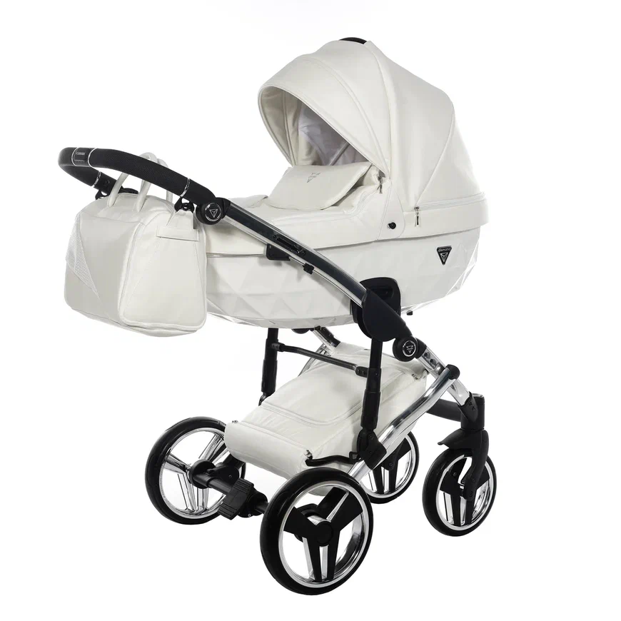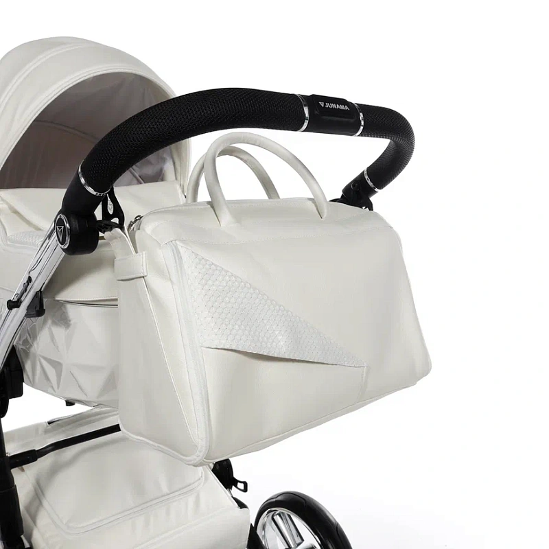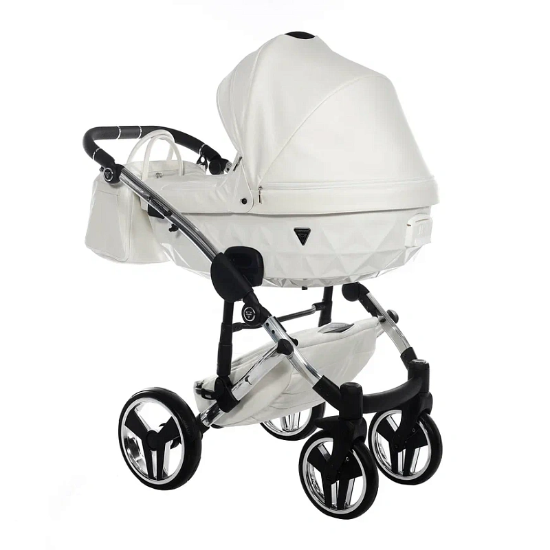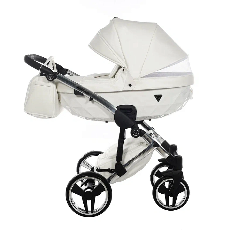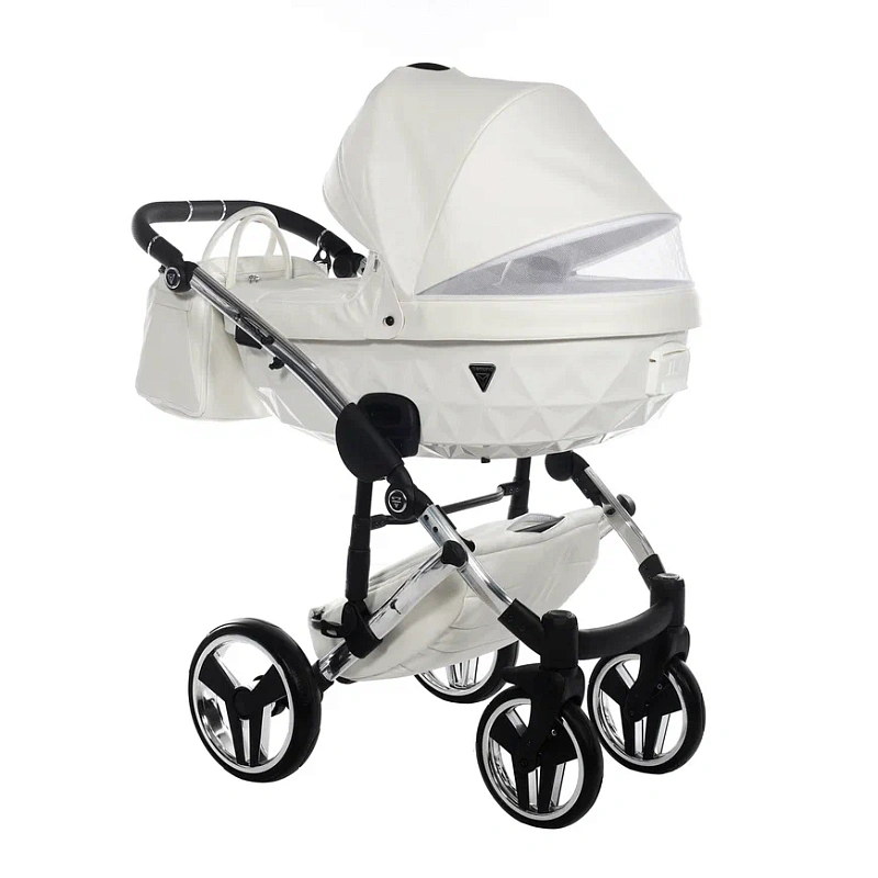 Junama Diamond Individual V2 3 в 1 — модульная коляска, которая отличается дизайном люльки в виде драгоценного камня, а также черными и белыми блоками. Цвет рамы меняется в зависимости от модификации: в данной она серебряная. Обновленная Version 2 получила несколько функциональных дополнений. В остальном это по-прежнему уникальная и функциональная коляска для прогулок по городу с ребенком с рождения до 3-4 лет.