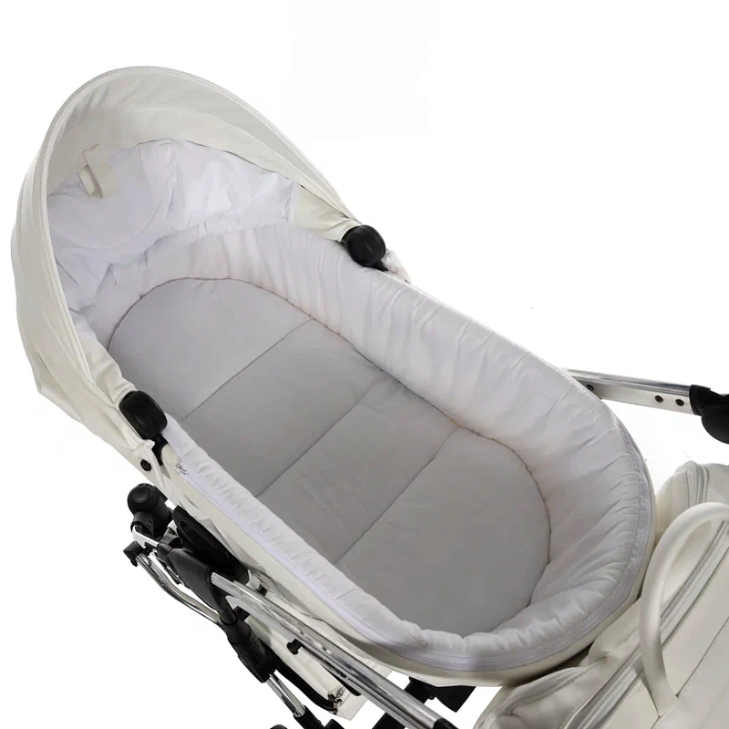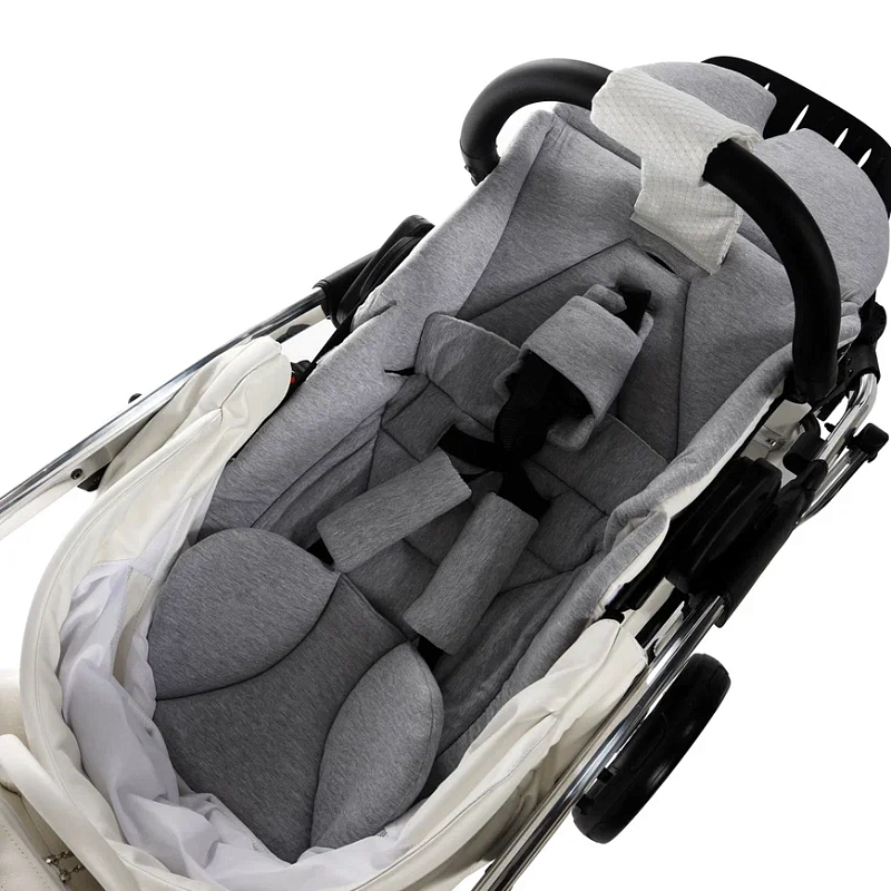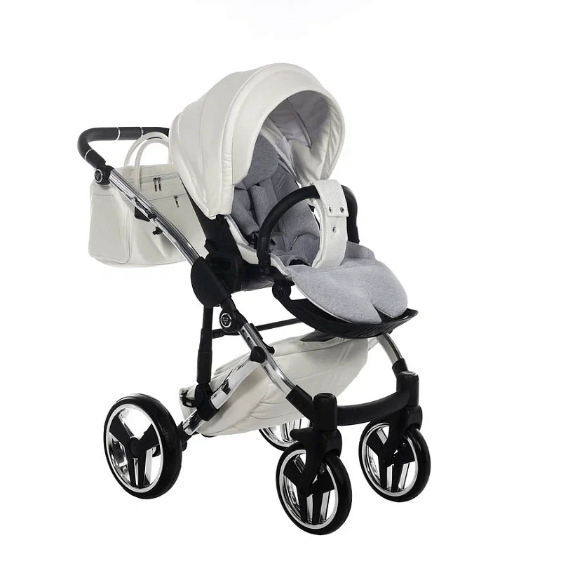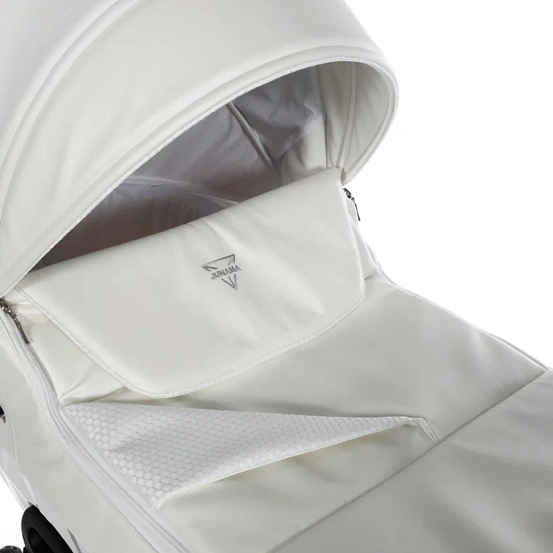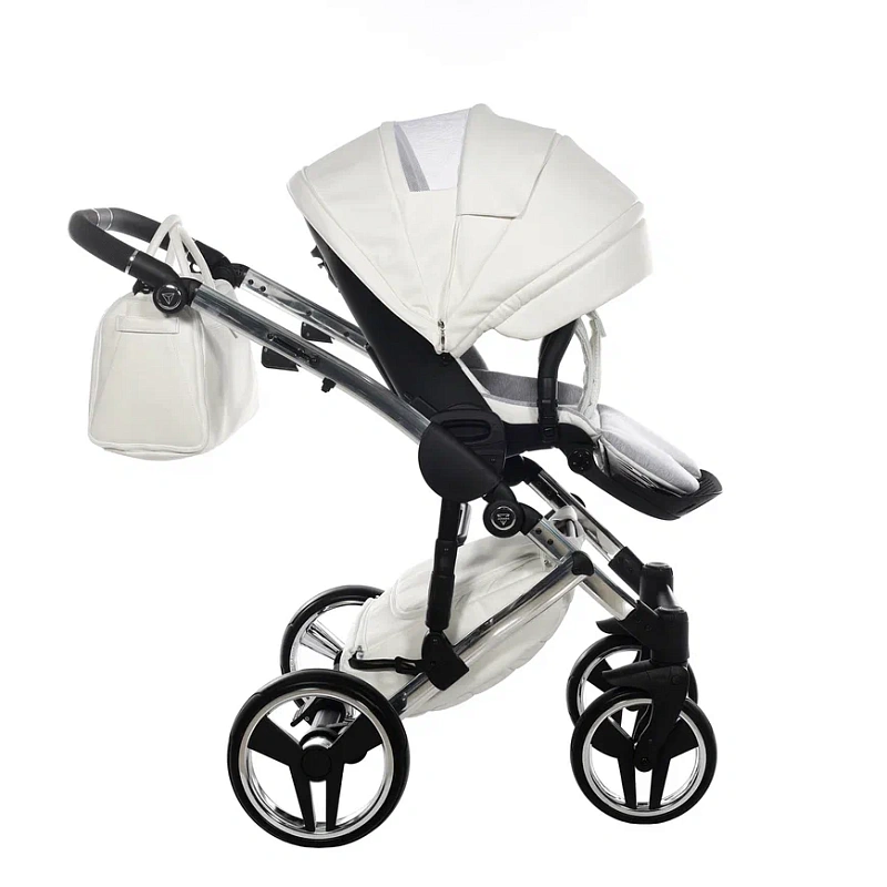 Junama Diamond Individual V2 3 в 1 — модульная коляска, которая отличается дизайном люльки в виде драгоценного камня, а также черными и белыми блоками. Цвет рамы меняется в зависимости от модификации: в данной она серебряная. Обновленная Version 2 получила несколько функциональных дополнений. В остальном это по-прежнему уникальная и функциональная коляска для прогулок по городу с ребенком с рождения до 3-4 лет.