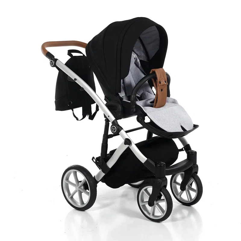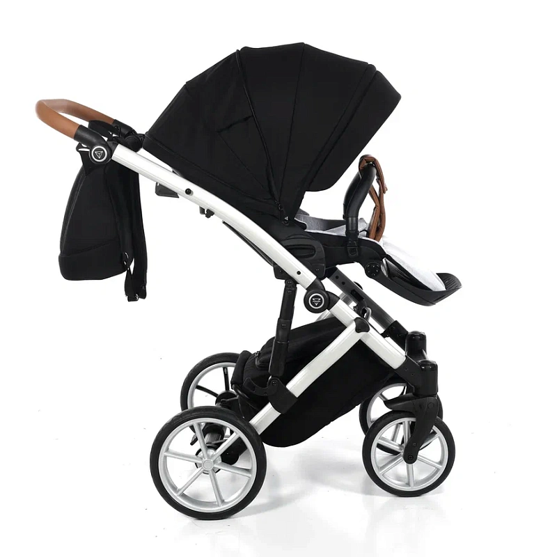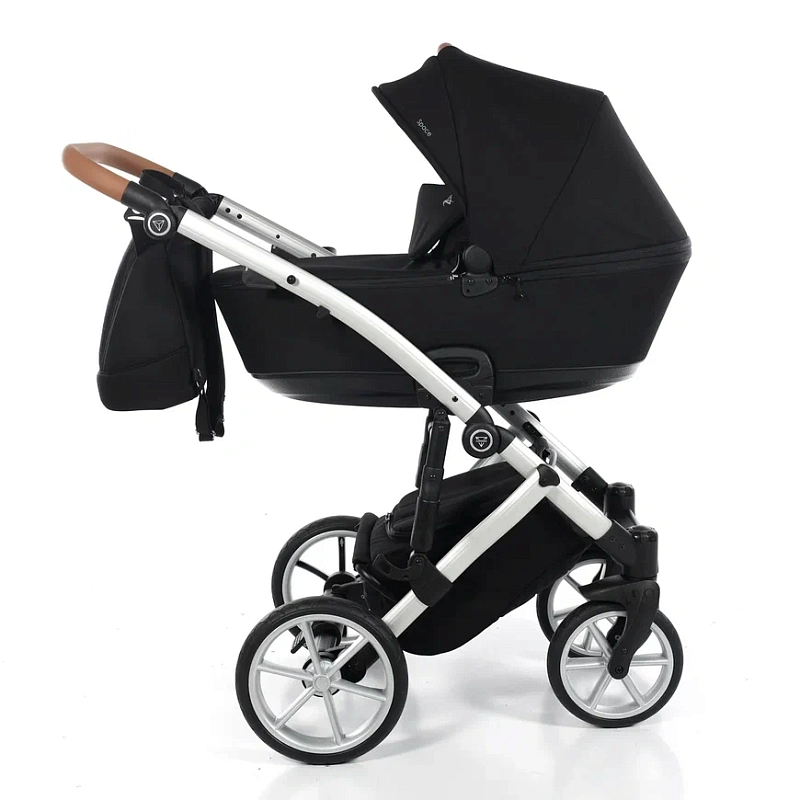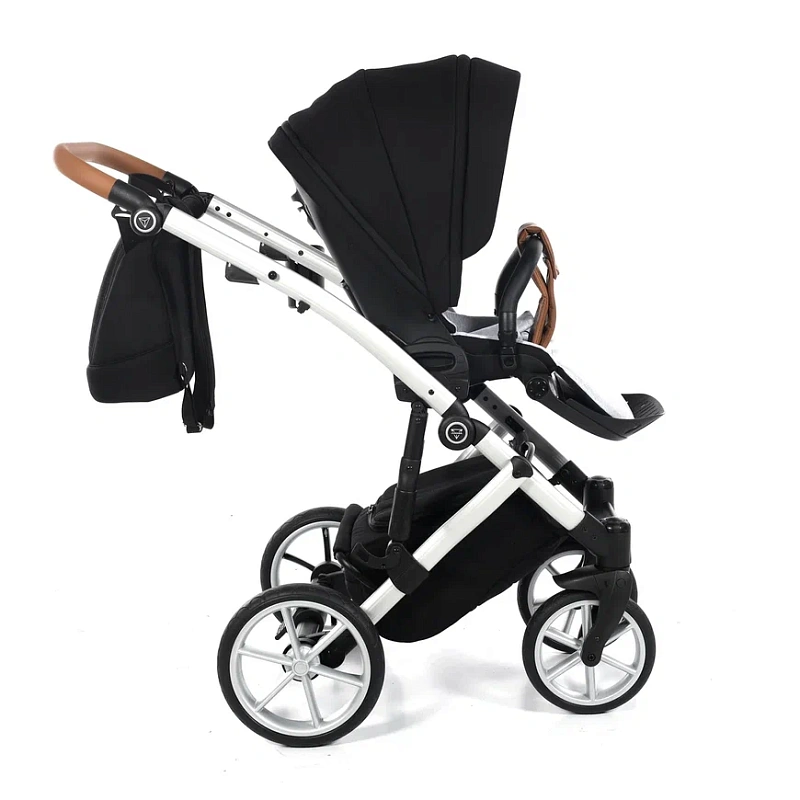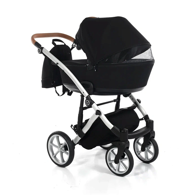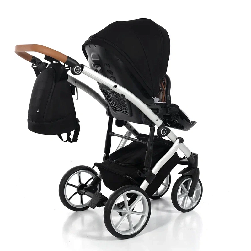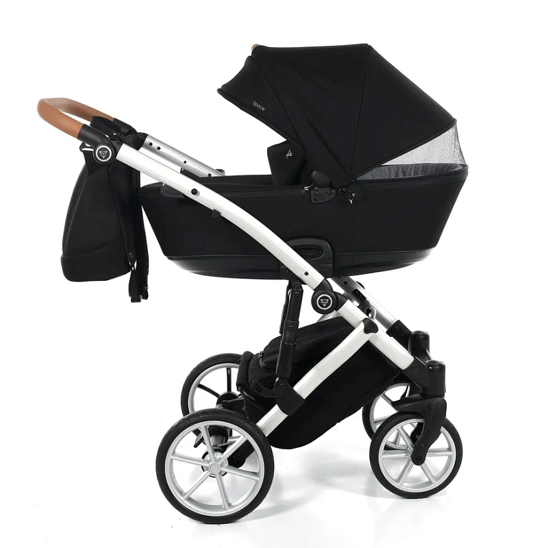 Рама алюминиевая — легкая, прочная, с элегантным покрытием белого цвета. Колеса в Junama гелевые, не нуждаются в подкачивании и не боятся проколов. Передние колеса для лучшей маневренности оснащены поворотной функцией. Система амортизации состоит из трех пар подвесок с регулировкой жесткости. Вместе с противоударной системой «антишок» они дают плавный и тихий ход коляске. На задних колесах установлен центральный тормоз. Корзина закрытая, компактная. Ручка имеет регулировку по высоте, покрыта искусственной кожей, за которую приятно держаться.