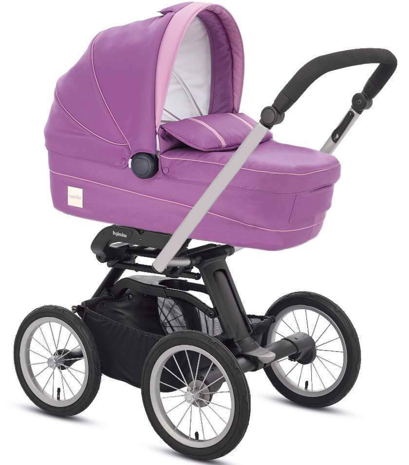 Шасси складывается методом «книжка» одной рукой. Метод сложения запатентован компанией «Инглезина». Ручка цельная, с регулировкой по высоте и мягкой на ощупь рукояткой. Колеса с амортизаторами, есть удобный ножной тормоз. Корзина внизу удобная, имеется встроенный подстаканник. Особенность модели — крупные надувные колеса с подшипниками без опции поворота у передних. Шасси классическое, хотя передние колеса немного меньше в диаметре.
