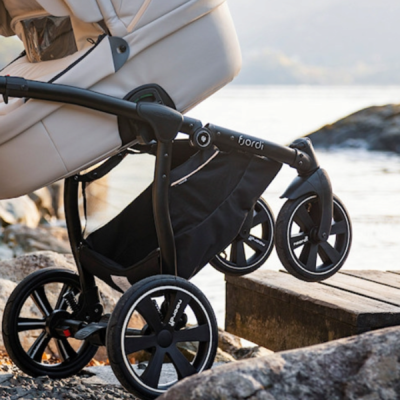 Рама в коляске Fjordi алюминиевая, складывается шасси вместе с прогулочным блоком. Ширина коляски (максимум 60 см) позволяет ей проезжать в любые дверные проемы и лифты. Система амортизации содержит два уровня жесткости. Колеса надувные, помогают амортизаторам справляться с дорожными ухабами. Передние обладают поворотной функций с фиксатором, на задних установлен тормоз. Ручка в коляске подходит под рост взрослых, место хвата покрыта качественной экокожей.