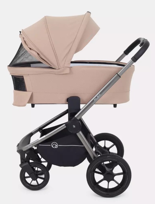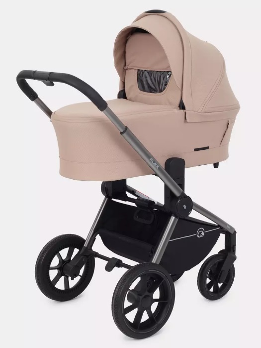 Капюшон люльки оснащен удобной ручкой для транспортировки, которая позволяет удерживать люльку в вертикальном положении, даже если внутри находится малыш. Капюшон можно регулировать бесшумно, и он имеет большой солнцезащитный козырек. Кроме того, в люльке есть дополнительная вентиляционная секция, которая увеличивает капюшон. Секция скрывается под прорезиненной молнией.