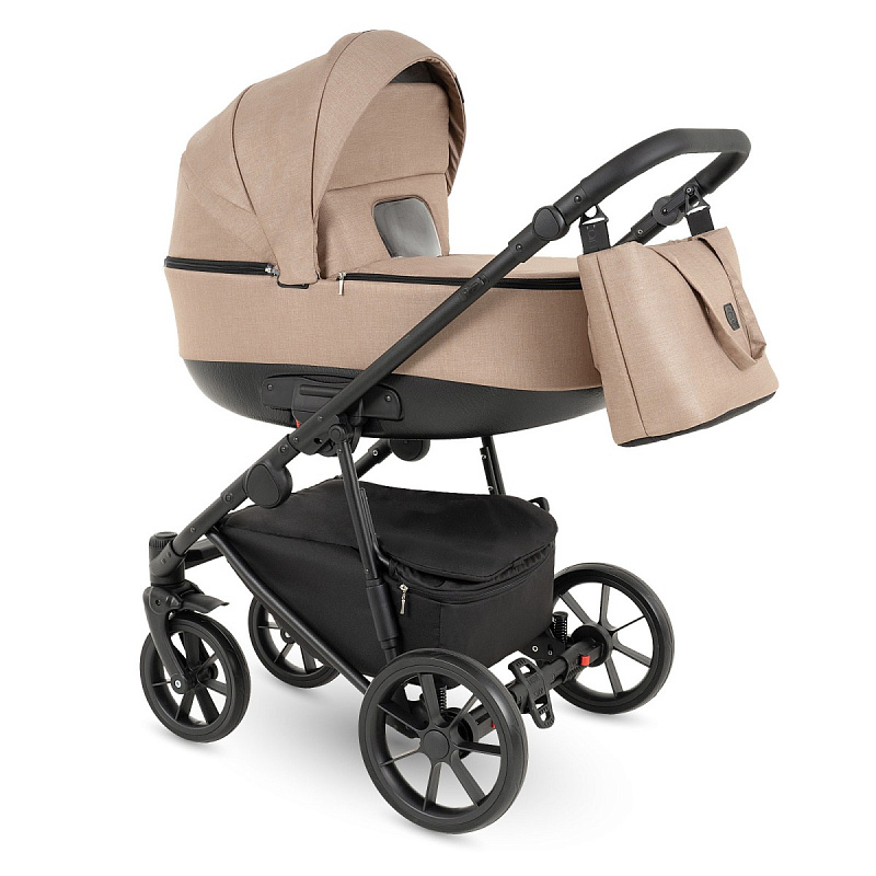 Коляска поставляется с практичными аксессуарами: вместительной сумкой для мамы, закрытой корзиной из экокожи для покупок, съемным держателем для бутылочек, плотным дождевиком и москитной сеткой. Эти элементы делают прогулки комфортными и удобными в любых условиях, а корзина легко моется, защищая вещи от пыли и грязи.