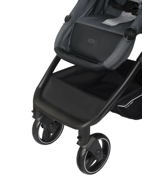 Колеса у коляски-трансформера Shuttle выполнены из вспененной резины. Это значит, что их не нужно подкачивать, специально обслуживать или менять в случае прокола. Тормоз в коляске центральный, но для удобства смещен чуть-чуть вправо. Багажная корзина открытая, вмещает до 2 кг. Передние колеса обладают свободным ходом и фиксацией для хода прямо. В сложенном виде есть фиксатор, чтобы модель не раскладывалась. В комплектацию также входят сумка-рюкзак, москитная сетка, подстаканник, страховочный ремешок.