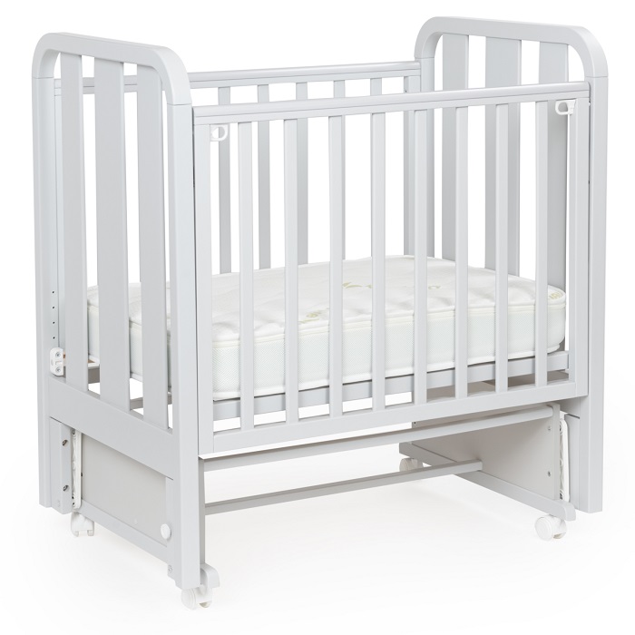 Кроватка совместима с матрасиком размером 90x60 см. Толщина матрасика – 12 см. На боковинах есть накладки из силикона. Мебель произведена в России.