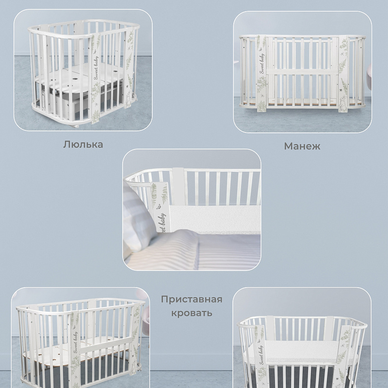 Sweet Baby Arte предлагает пять вариантов трансформации: просторная кровать для подросших детей, компактная люлька для новорожденных, приставная кроватка для совместного сна, диванчик для отдыха и игровой манеж. Эти конфигурации делают кроватку универсальной, подходящей для использования на протяжении нескольких лет.