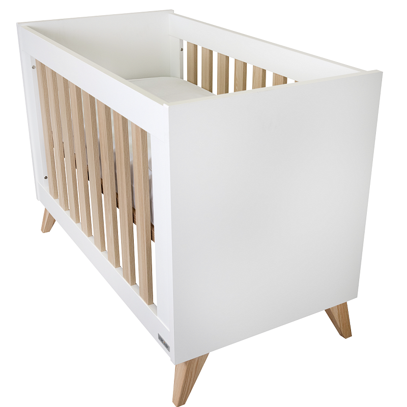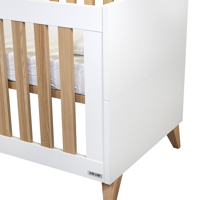 IKid Lazio – кроватка, сделанная в современном лофтовом дизайне. Каркас кровати белый, дополняется ламелями натуральных расцветок.