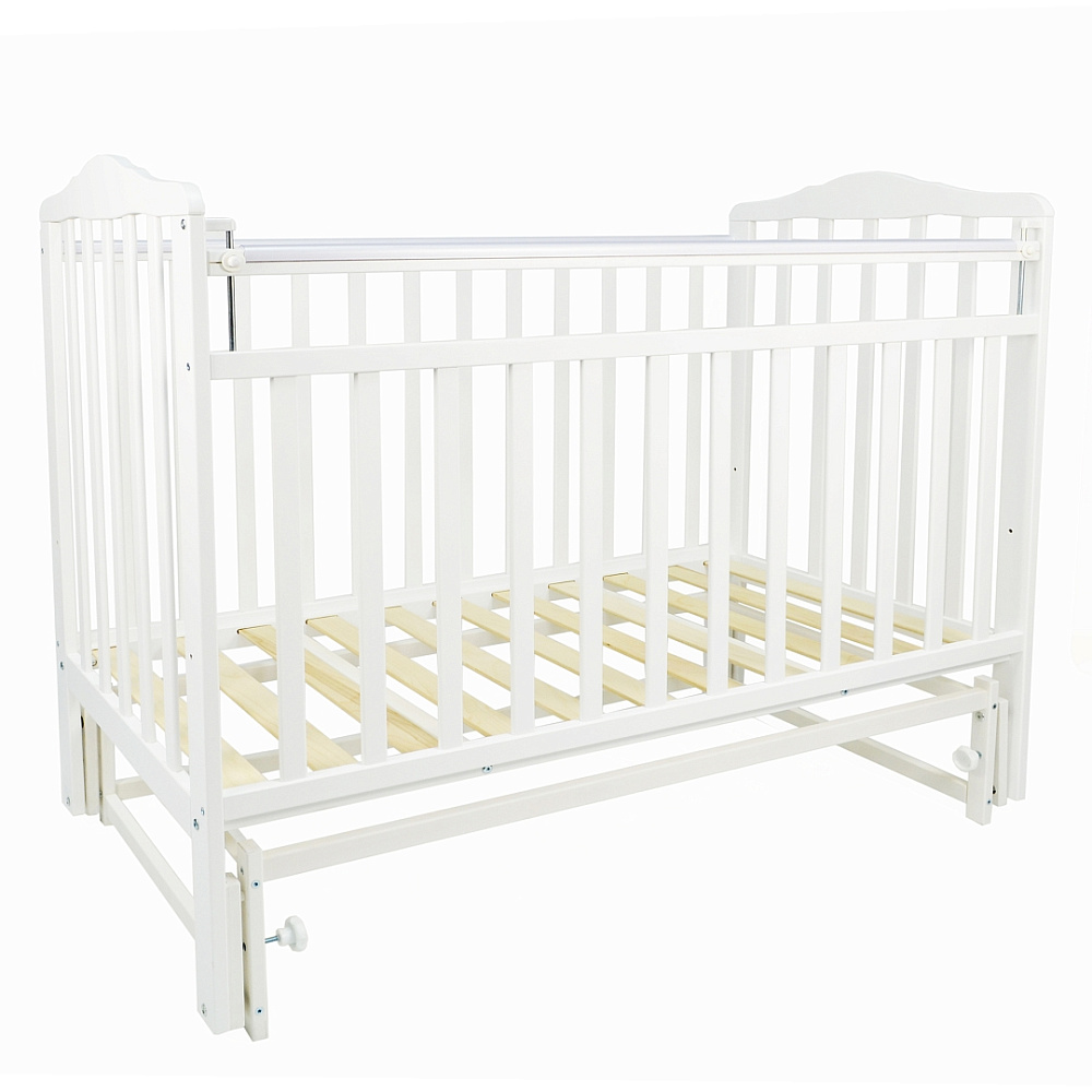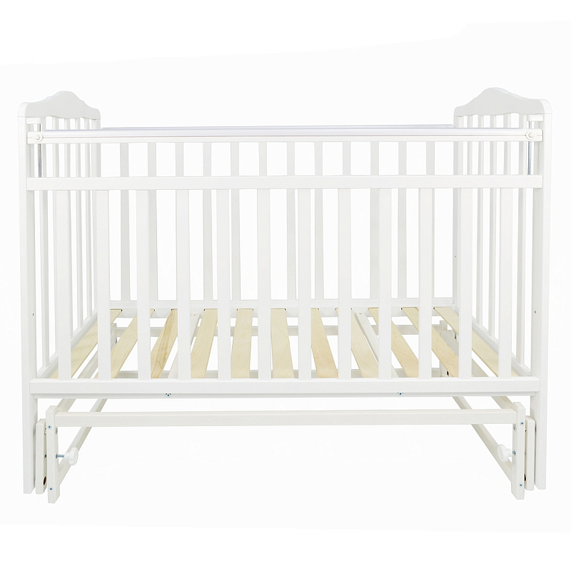 На передней стенке подвижной является только верхняя планка. Кроватка оснащена поперечным маятником, способным укачать кроху. Маятниковый механизм при необходимости можно застопорить. Дно состоит из реек, хорошо вентилируется. Спальная основа регулируется по высоте в двух положениях. В комплект входят накладки из силикона, которые выполняют функцию “антигрызунков”.