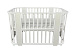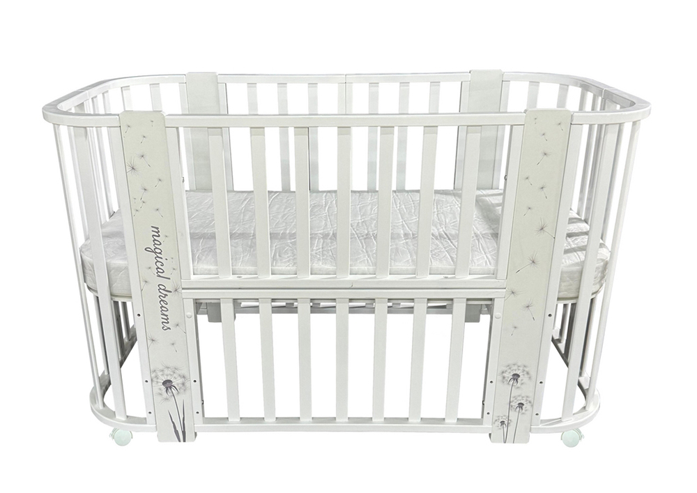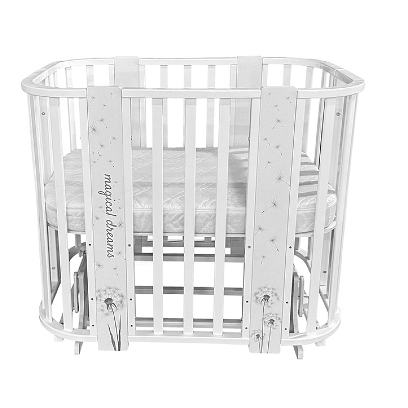 Кроватка трансформируется из колыбели в приставную и подростковую кровать, манеж и диванчик. Модель реализована в белом цвете без изображений, а также в белом цвете с различным декором.