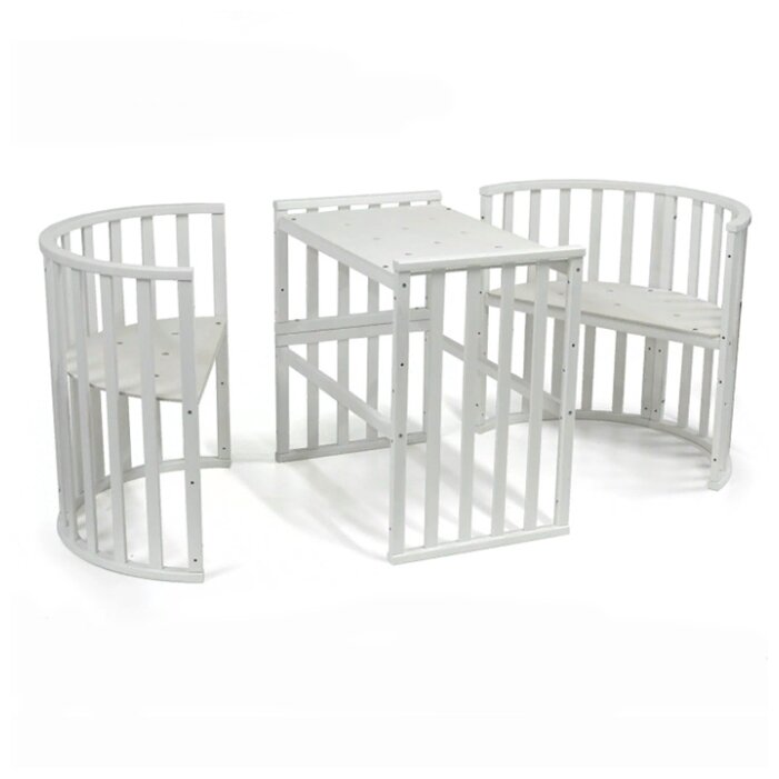 Для самых старших кровать превращается в парту с двумя креслами для занятий и игры. У кроватки есть колесики для удобного перемещения мебели по дому. Максимальный возраст ребенка — 4 года. У спальной основы всего 3 положения. На дне спального ложа имеются вентиляционные отверстия. У кроватки есть возможность использовать маятник, который приобретается отдельно.