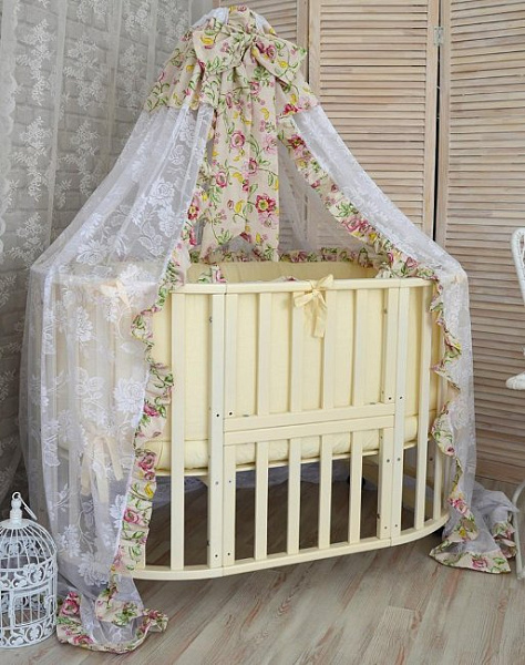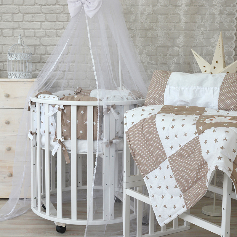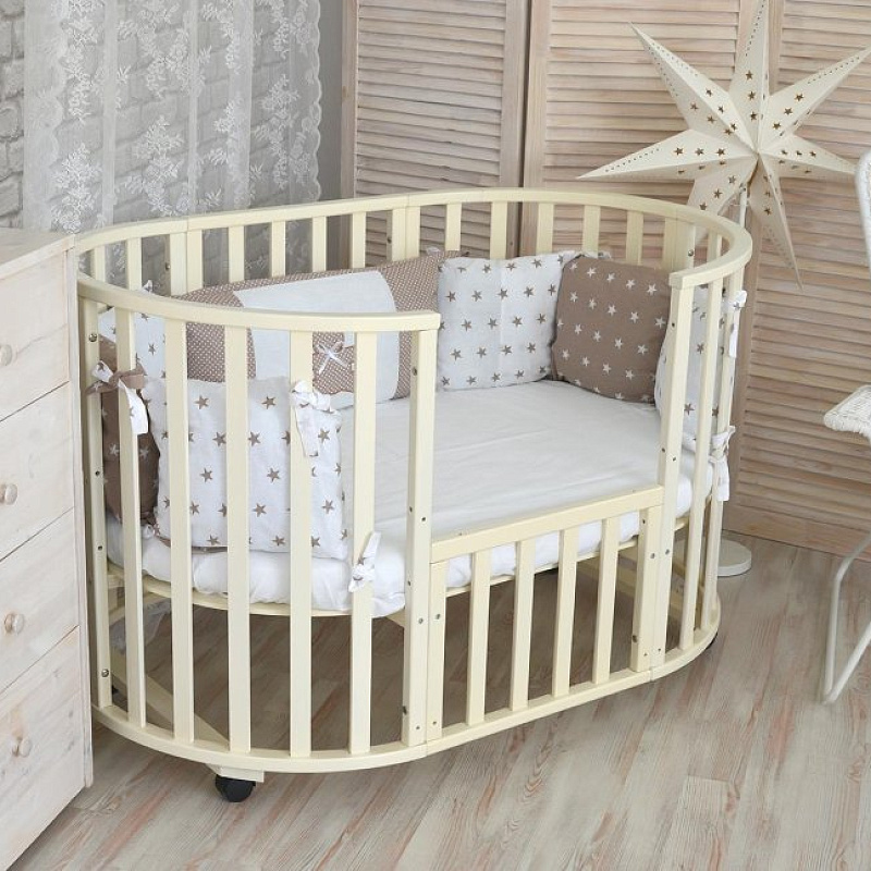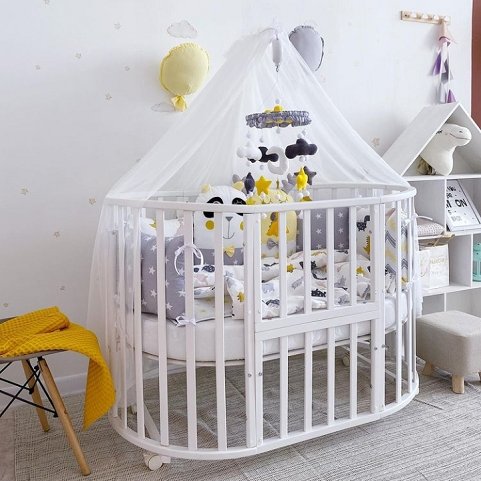 Для новорожденного ребенка подойдет круглая кроватка в виде колыбели. Это небольшая, целиком защищенная и безопасная мебель, чтобы крохе было уютно, как в мамином животе. Малышу постарше подойдет овальная кроватка с большим спальным местом 125x75 см.