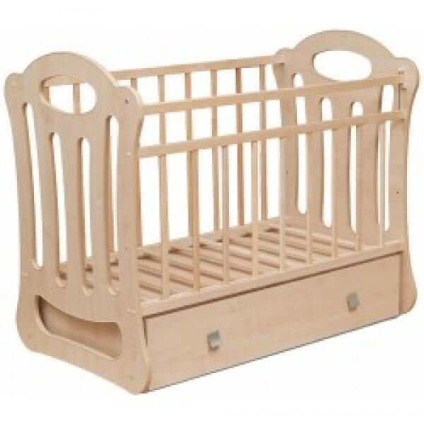 Классическая деревянная кроватка от уфимского производителя ВДК. Выполнена из натуральной березы и ЛДСП. Не содержит рисунков на боковине, но включает массу полезных практичных опций, среди которых укачивающий механизм, опускающаяся передняя стенка, выдвижной ящик, несколько уровней спального места.