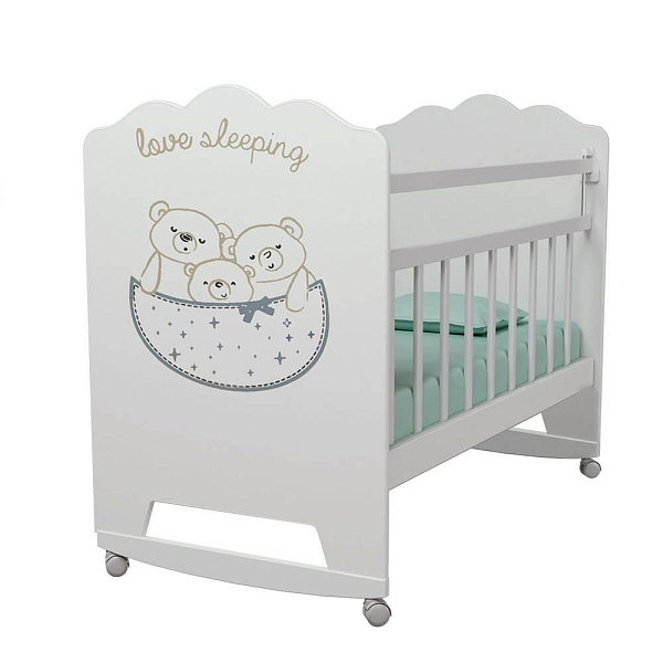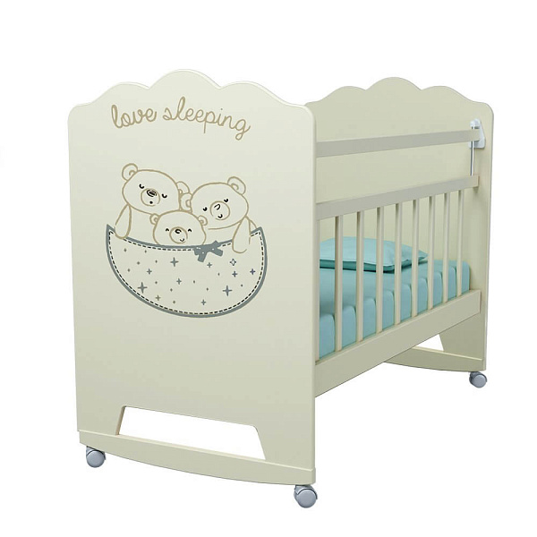 ВДК Love Sleeping (Лав Слипинг) — детская кроватка с качалкой/колесами и оригинальным рисунком спящих медвежат на левой боковой части