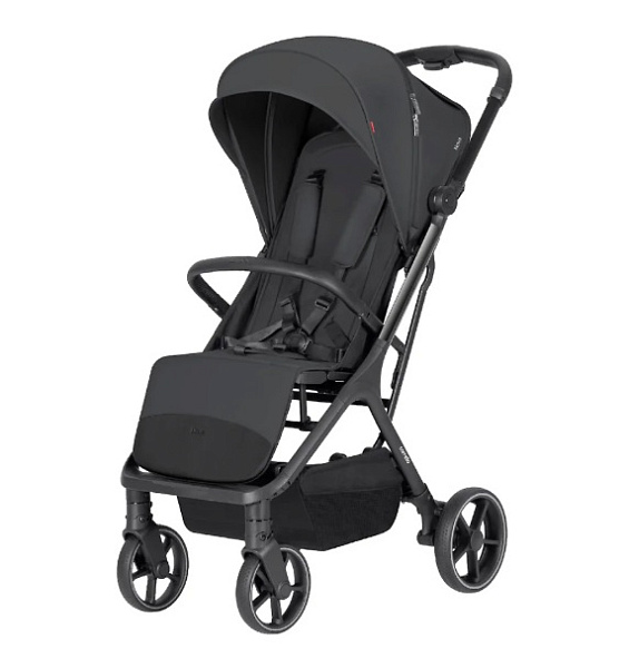 Обновленная рама 2025 года оснащена пружинной амортизацией на всех колесах, обеспечивая мягкий ход на неровных поверхностях. Полиуретановые колеса с увеличенным диаметром устойчивы к проколам и не требуют обслуживания, а расширенная на 1 см колесная база добавляет устойчивости. Передние поворотные колеса повышают маневренность, хотя фиксация для прямого движения отсутствует. Педальный тормоз на задней оси надежно фиксирует коляску, не повреждая обувь. Ручка, покрытая экокожей, оснащена механизмом автоматического складывания в компактную книжку, позволяя коляске устойчиво стоять вертикально. Вместительная корзина с жестким дном выдерживает до 3 кг и имеет удобный доступ даже при опущенной спинке.