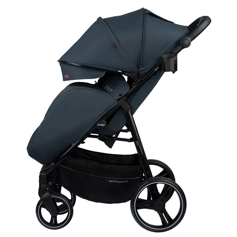 У коляски Indigo Spark практичные колеса из вспененной резины и мягкие амортизаторы. Передние колеса способны вращаться вокруг своей оси и фиксироваться, если необходимо двигаться только прямо. Ручка регулируется по высоте, а багажная корзина внизу пригодится для покупок.