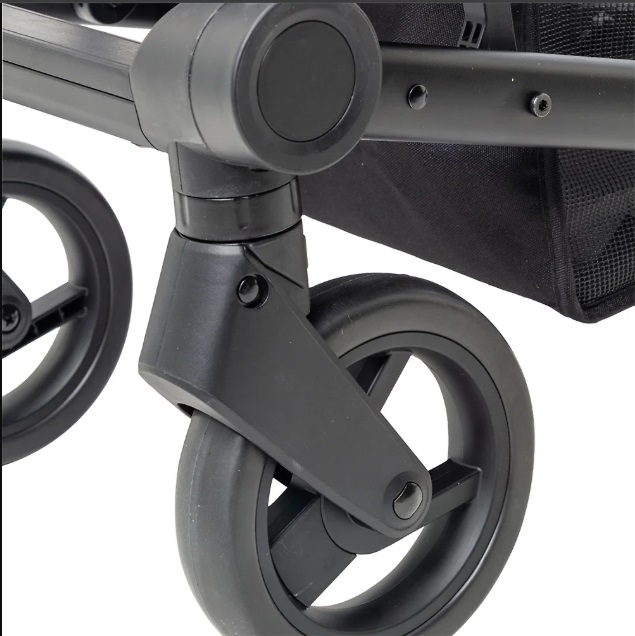 Шасси коляски выполнено из лёгкого алюминия с телескопической ручкой, покрытой экокожей с прочным швом, регулируемой по высоте для удобства родителей. Полиуретановые колёса устойчивы к проколам, а рессорная амортизация на задних колёсах и система «антишок» на передних обеспечивают плавный ход по неровностям, включая щебень и песок. Передние колеса фиксируются для повышения проходимости. Вместительная сетчатая корзина с жестким дном позволяет перевозить до 5 кг вещей, оставаясь доступной даже при опущенной спинке.