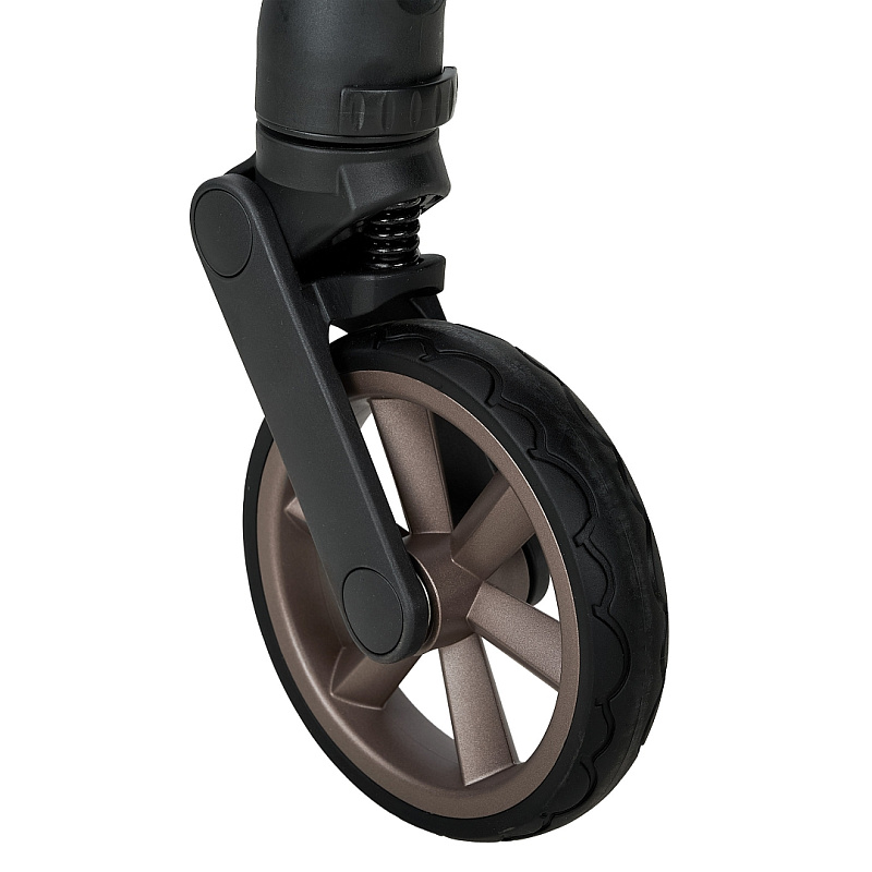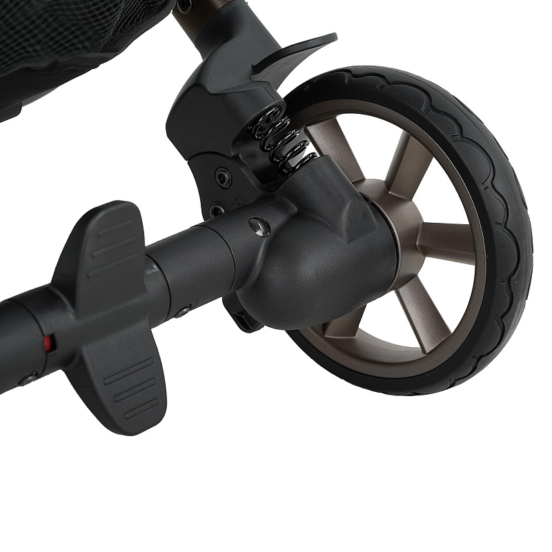 Шасси коляски оснащено мягкой подвеской и шариковыми подшипниками на каждом колесе, что положительно влияет на плавность хода и маневренность. Диаметр задних колес составляет 15 см, передние колеса диаметром 13 см имеют амортизацию и могут блокироваться при необходимости.
