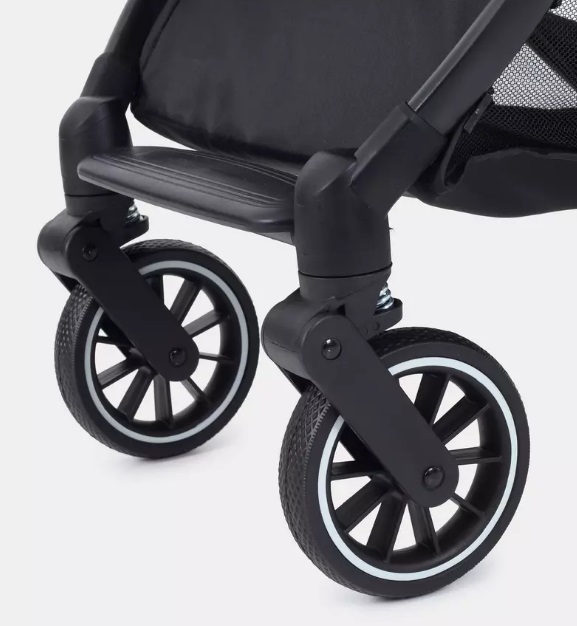 В комплекте с моделью Juno идет накидка на ножки. Оборудована вторая подножка для самостоятельного размещения ребенка в коляске. Плавный ход коляске обеспечивает пружинная амортизация.