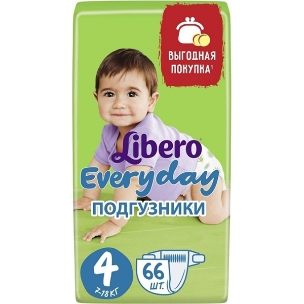 Детские подгузники Libero Everyday с ромашкой 4 Maxi, 7-18 кг, 66 штук