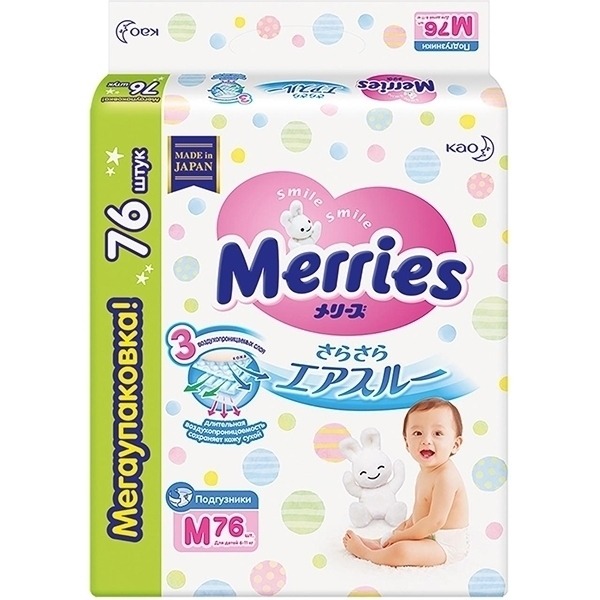 Детские подгузники Merries M, 6-11 кг, 76 штук