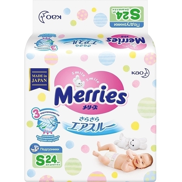 Детские подгузники Merries S, 4-8 кг, 24 штуки