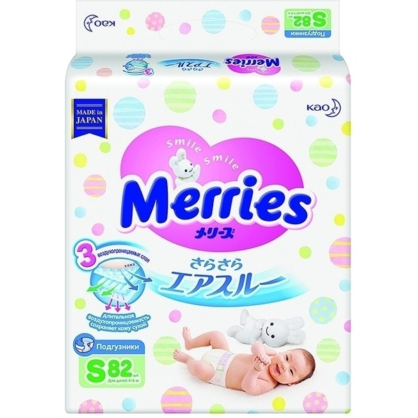 Детские подгузники Merries S, 4-8 кг, 82 штуки