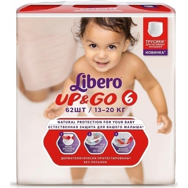Универсальные детские трусики Libero Up&Go 6 Extra large предназначены для подросших детей. Трусики надеваются, как обычное белье, абсолютно не ощущаются на теле, не доставляют дискомфорта. Внутренний слой моментально поглощает влагу благодаря уникальной поверхности Dry Tech и суперабсорбирующим гранулам. Трусики можно легко снять, разорвав боковые швы. Для утилизации предусмотрена специальная клеящая лента.