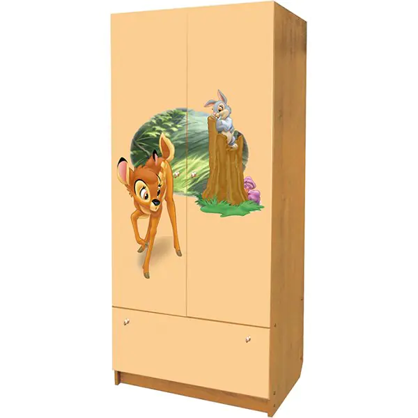 Детский шкаф Disney Бэмби ШДП выполнен из ламинированных панелей ДСП, покрытых полиуретановыми эмалями с антиаллергенным составом. Глянцевый блеск фасада в сочетании с красочными иллюстрациями мультяшных героев превращают Disney Бэмби в оригинальное украшение детской. Две створки распахиваются легко и бесшумно. Внутри детского шкафа Дисней Бэмби расположены полки и вешало.