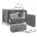 Конструкция компактно складывается и помещается в сумку, оснащенную отверстиями для колес. Такое решение позволяет катить манеж за собой, как небольшой чемодан.