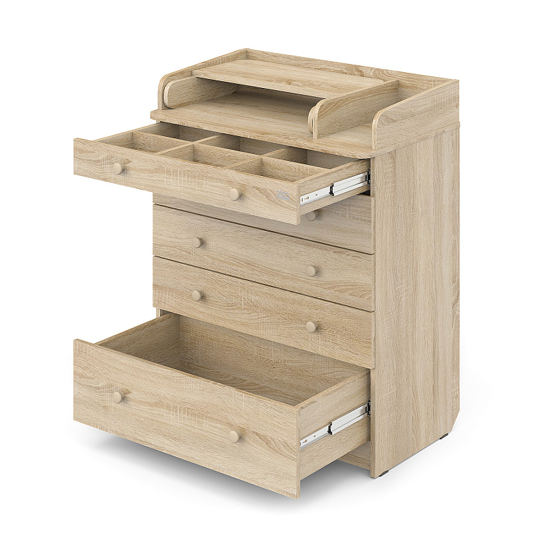 Мебель изготовлена из ЛДСП. Включает пять вместительных ящиков на шариковых направляющих. Есть органайзер для детских вещей и пеленальная доска, которые добавляют изделию практичности.