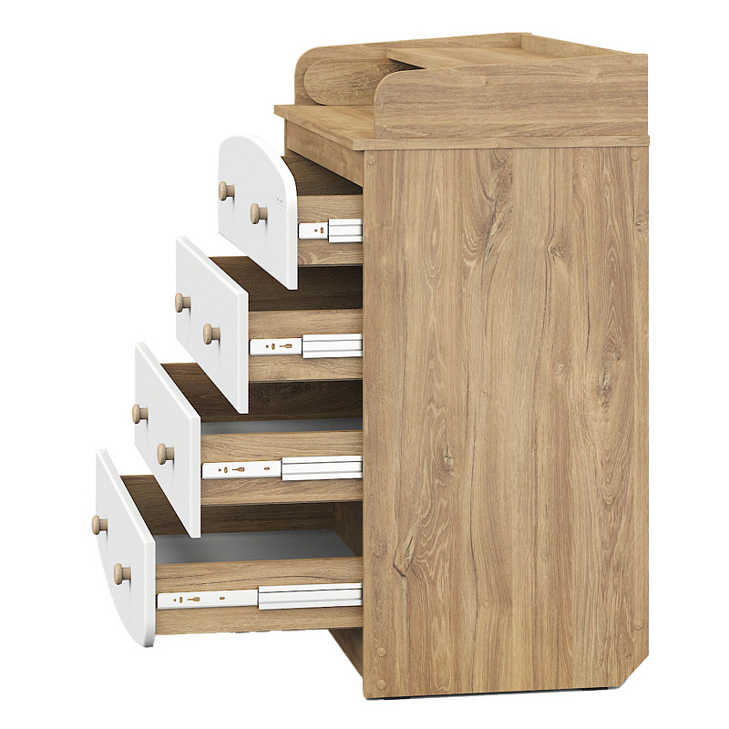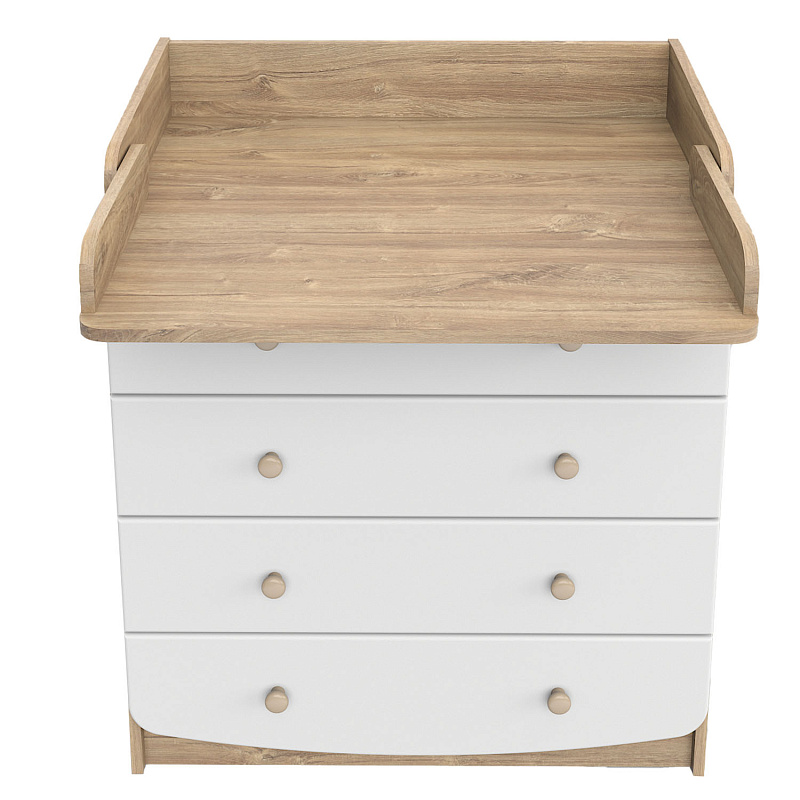 Удобный, стильный и минималистичный комод порадует родителей своей функциональностью. Он идеально подходит для ухода за ребенком благодаря откидному столику для пеленания. Любители эстетики оценят стильный дизайн фасадов и функциональные ручки круглой формы.