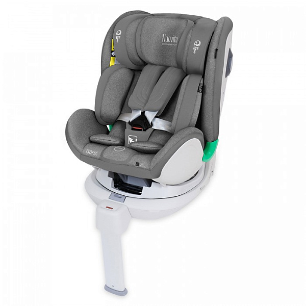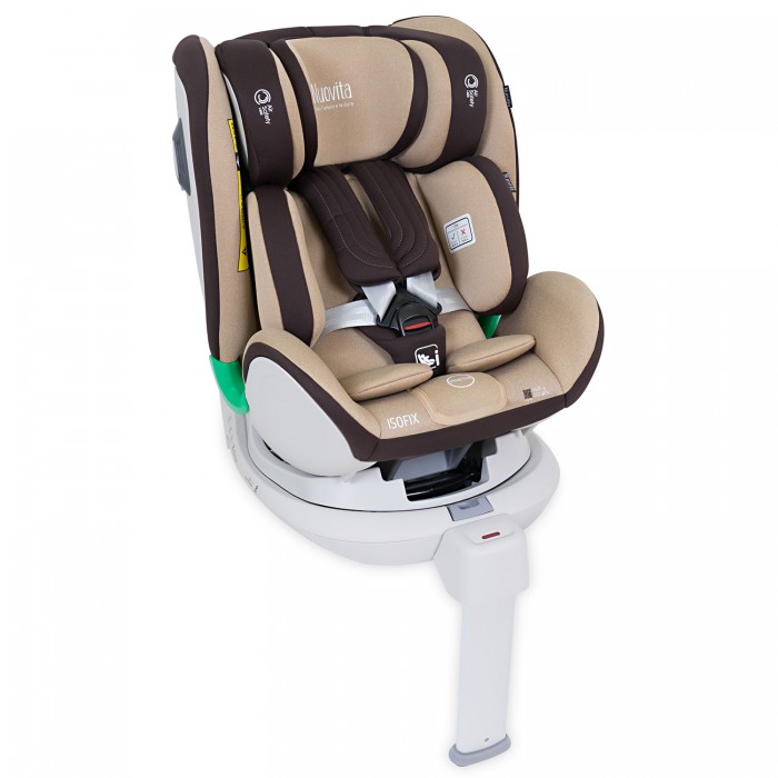 Автокресло «Нуовита Макционе» идет в комплекте с базой, на которой стоит телескопическая опора для упора в пол, гарантирующая защиту от переворачивания кресла. Есть также индикаторы правильной установки, что защищает родителей от ошибок. Внутри кресла ребенок фиксируется 5-точечными ремнями безопасности.