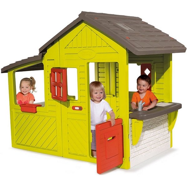 Красивая крыша с имитацией черепицы, прочные стены, стилизованные под дерево, массивная дверь с электронным звонком и окошко со ставнями – этот коттедж понравится каждому ребенку. Устойчивый и прочный домик садовода Smoby выполнен из высококачественного французского пластика. Он легко собирается и не разваливается даже в слишком ветреную погоду. Внутри предусмотрено много места для нескольких детей, благодаря чему в комнате может собираться большая компания озорных детишек. Домик Смоби 2015 станет для малыша уютным гнездышком, в котором он сможет проводить досуг дома или на улице. Дополнительно коттедж оснащен вазоном, в который можно посадить живые цветы, а также раковиной с краном и решеткой для барбекю.