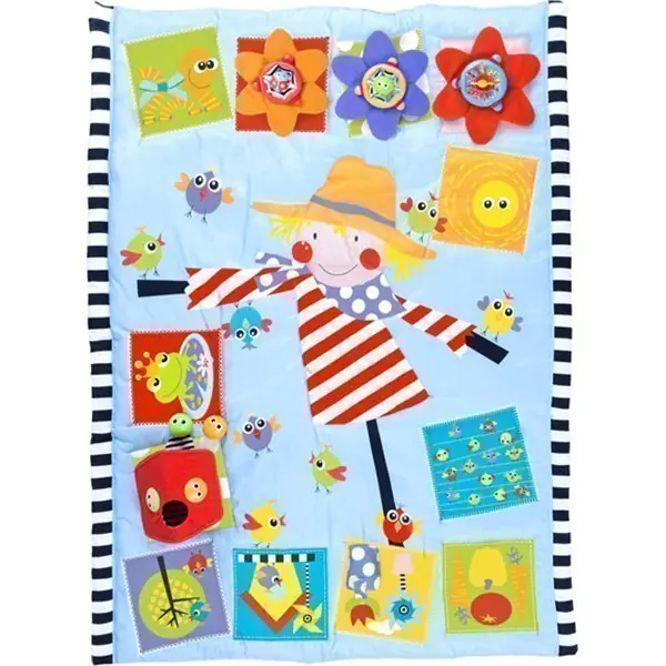 • помимо коврика в комплект входит мягкий объемный домик, шарики-погремушки, цветочки из ткани и небольшие игрушки из пластика