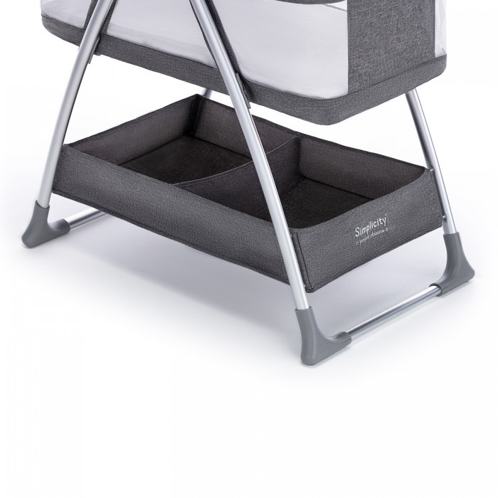В нижней части располагается текстильная корзина для вещей. Она фиксируется к ножкам пластиковыми пуговицами, поэтому ее не сложно снимать и чистить. Конструкция самой люльки состоит из устойчивого к ударам пластика и алюминиевого профиля. На ножках-распорках имеются нескользящие накладки, обеспечивающие колыбели отличную устойчивость на любом покрытии.