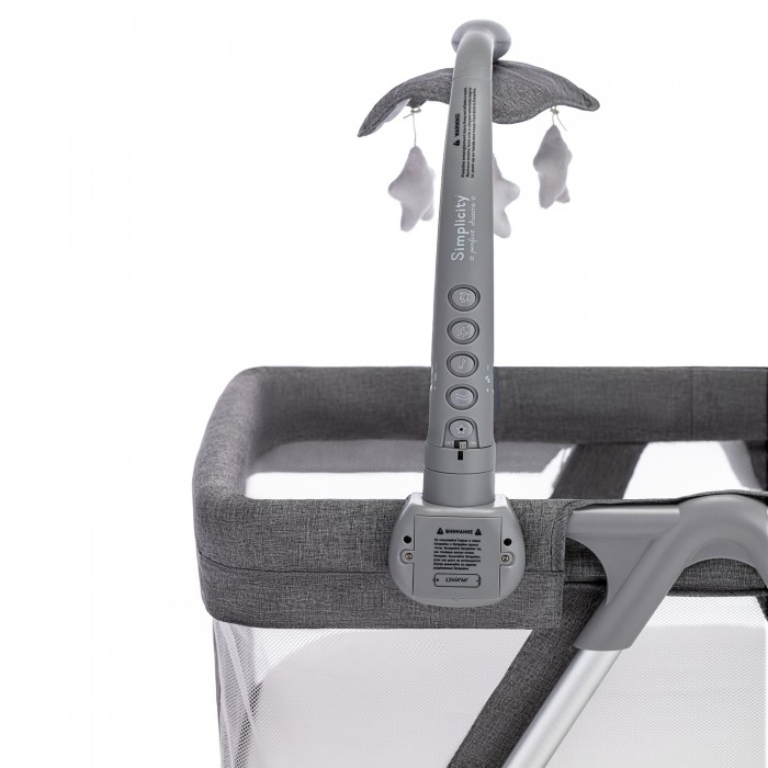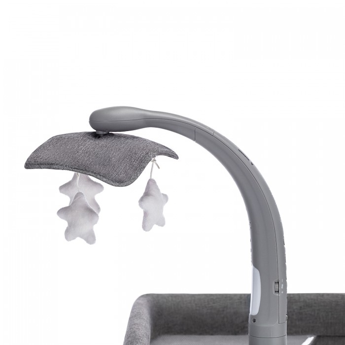 Колыбель комплектуется современным музыкальным мобилем с подвесными игрушками, работающим от батареек. Особенность мобиля — возможность установить его слева либо справа на люльке колыбели. У этого устройства ряд функций, среди которых бегающие огни, подсветка в темное время суток, виброукачивание, мелодии, вращение игрушек. Можно регулировать интенсивность вибрации, громкость музыки, таймер. Виброукачивание спасает малыша, в частности, от коликов.