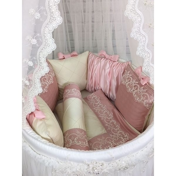 Нежный комплект постели для круглой и овальной кроватки Marele Зефирка станет прекрасным подарком для новорожденной малышки. Все детали выполнены из качественных натуральных материалов и очень функциональны. Красиво украшенный плед подойдет не только для кроватки, но и для выписки из роддома, прогулки с коляской или похода в гости. Декоративный валик можно использовать как ограничитель между малышом и стенкой кроватки или как подушку-позиционер. Наличие в комплекте мягких подушечек-бортиков убережет кроху от ушибов и застревания между вертикальными планками ограждения.