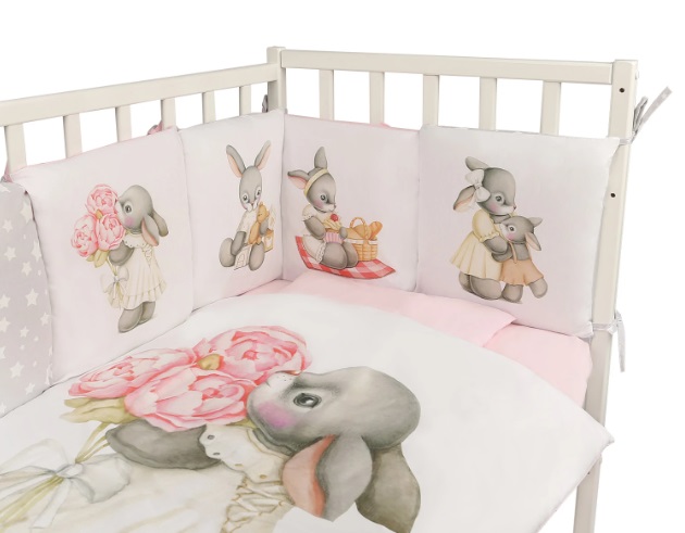 Защитный бортик состоит из 12 подушечек размером 30х30 см с чехлами на молнии, которые легко снимаются для стирки, упрощая уход за комплектом. Все элементы выполнены из поплина с яркой цифровой печатью, что гарантирует долговечность и привлекательный внешний вид. Этот комплект сочетает функциональность и стиль.