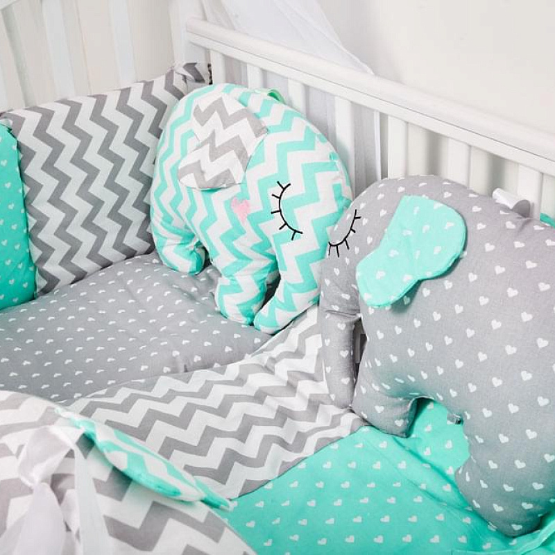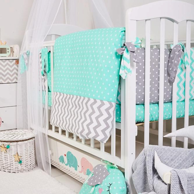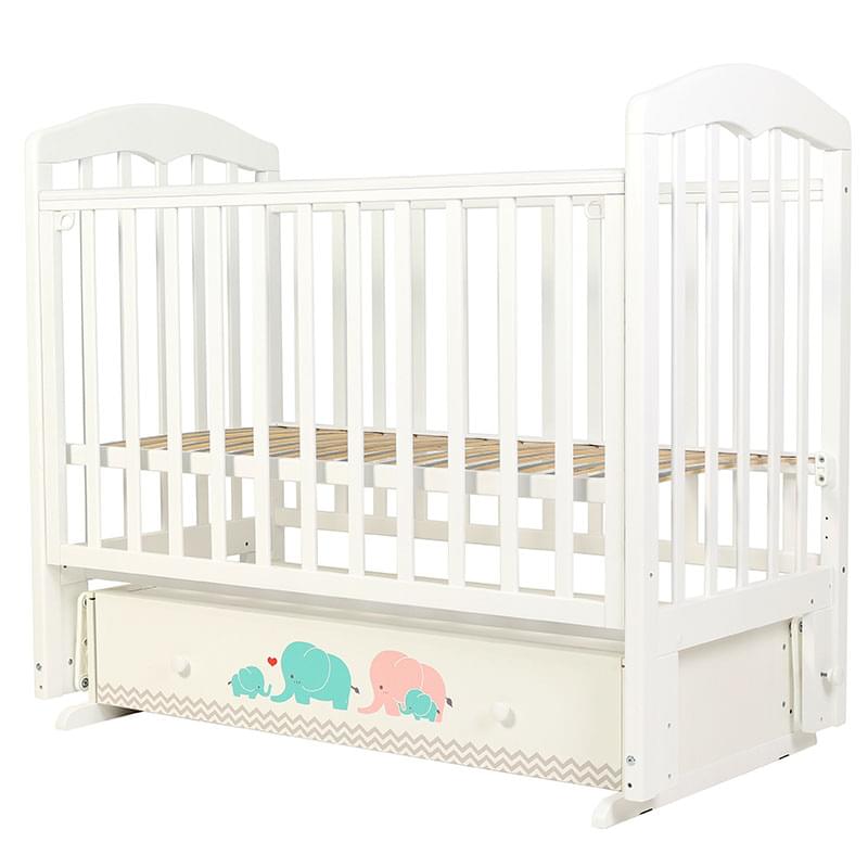 Модель снабжена ящиком для постельного белья, фасад которого украшают принтованные слоники. Чтобы к малышу был удобный доступ, верхнюю стенку переднего ограждения можно опустить простым нажатием кнопки. Ложе имеет ортопедические свойства за счет гнутых реек «латофлекс». Фиксируется в трех положениях.