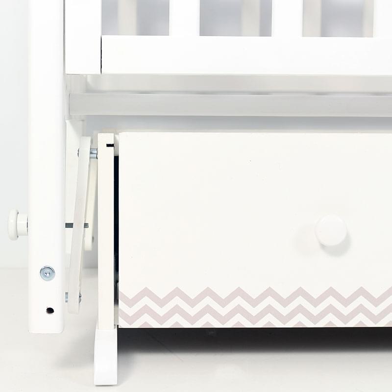 Кроватка «Сильвия» комплектуется опускающейся стенкой переднего ограждения, ортопедическим ложем, универсальным маятником, силиконовой накладкой на стенках ограждения и шириковыми направляющими.