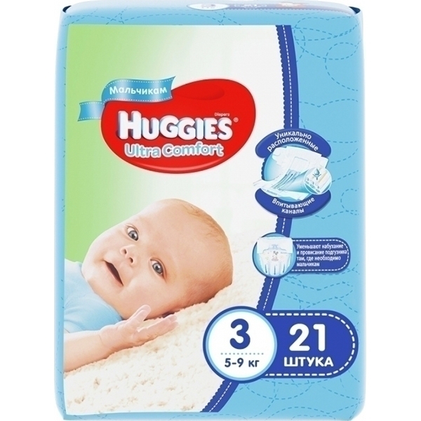 Подгузники для мальчиков Huggies Ultra Comfort 3 (Хаггис Ультра Комфорт) с уникальными впитывающими каналами