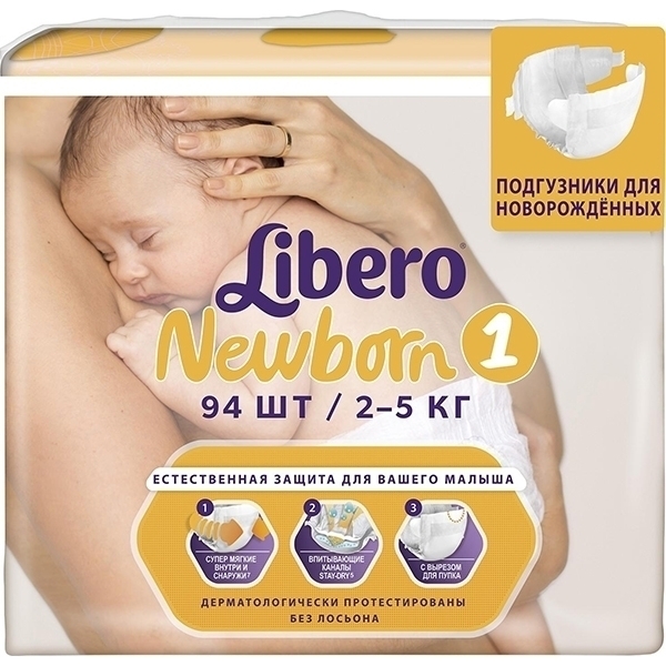 Мягкие подгузники для новорожденных Libero Newborn 1 изготовлены с учетом анатомических особенностей тела младенца. Изделие имеет специальный защитный вырез для пупка, а крепления для застежек не натирают кожу.