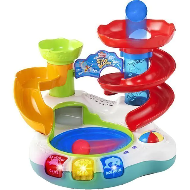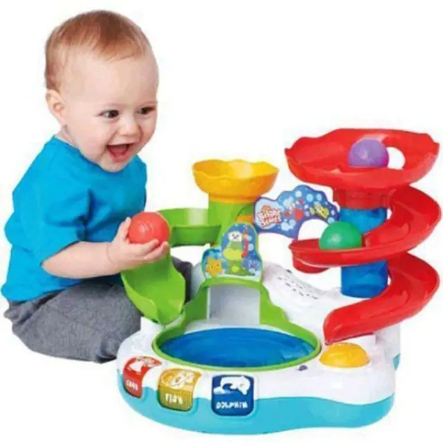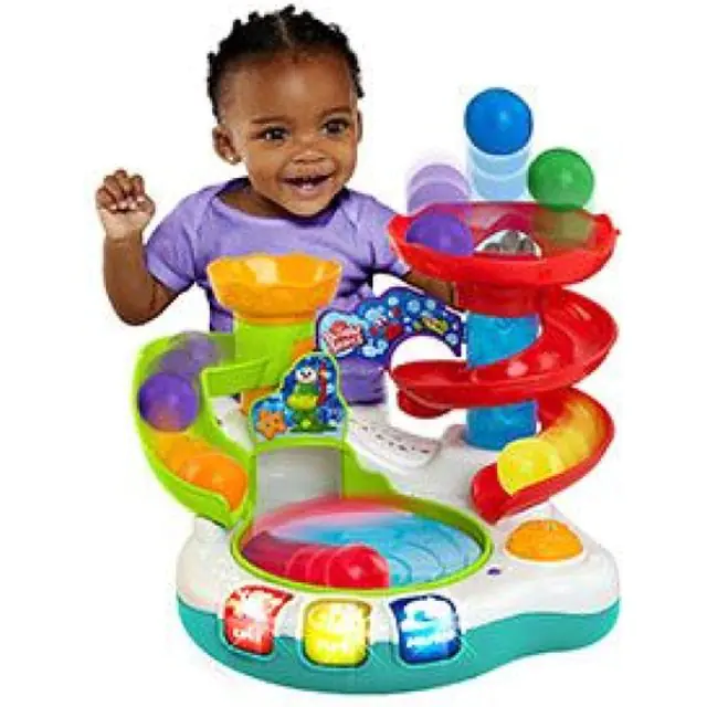 Малышу предстоит забавляться с пятью цветными шариками, которые катятся с горки прямо в бассейн, вращаются в нем, а затем попадают в трубу и выскакивают вверх. Еще один плюс – звуковое сопровождение: развивающая игрушка Bright Starts (Брайт Стартс) Аквапарк 9176 проигрывает различные мелодии, среди которых есть экзотическая музыка из тропиков и простые звуки. На интерактивной панели расположены три клавиши, нажав на которые ребенок познакомится с названием трех животных. Купить развивающую игрушку Bright Starts (Брайт Стартс) Аквапарк родители могут за приемлемую цену в интернет-магазине koliaski-krovatki.ru. Для работы изделия необходимо приобрести четыре батарейки «С».