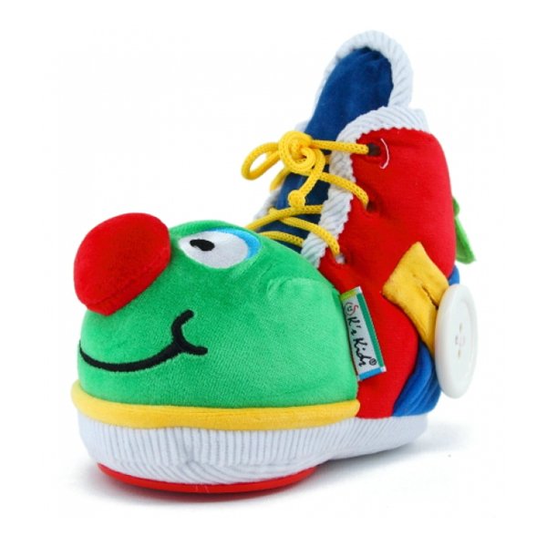 • На ботиночке можно найти шнуровку с зеркальцем, пищалку в носике, молнию, разнообразные пуговицы, кнопки и застежки. В процессе игры, малыш учится шнуровать, застегивать молнии и пуговички. Это прекрасный тренажер для мелкой моторики, которая стимулирует всестороннее развитие ребенка.