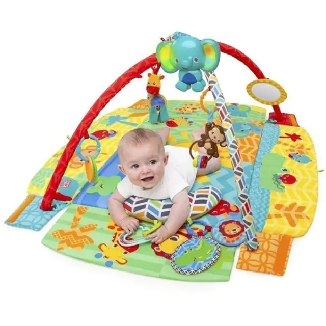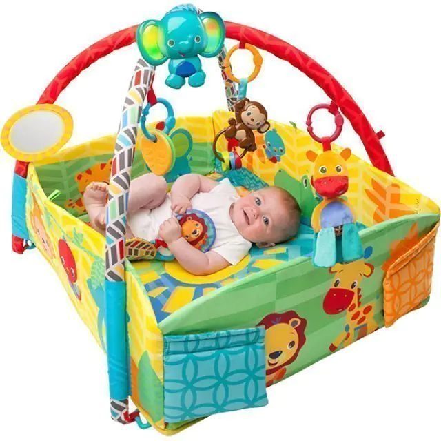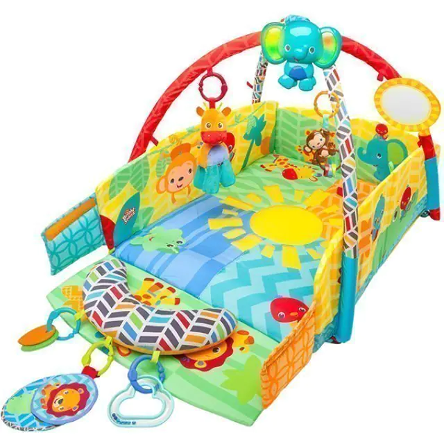 Многофункциональная игровая зона оснащена интересными развлекательными элементами, которые обеспечат крохе увлекательный и полезный для всестороннего развития досуг. Мультифункциональный развивающий коврик Bright Starts (Брайт Стартс) Солнечное Сафари 52157 сшит из гипоаллергенного текстиля и украшен красочными рисунками. Для забавы в нем предусмотрены погремушки, прорезыватели и регулируемое по высоте зеркальце, а музыкальный модуль проигрывает мелодии. Купить развивающий коврик Bright Starts (Брайт Стартс) Солнечное Сафари за приемлемую цену мама может в интернет-магазине koliaski-krovatki.ru. В комплект входит мягкая подушечка-валик, на которой малыш сможет отдыхать лежа на животике.